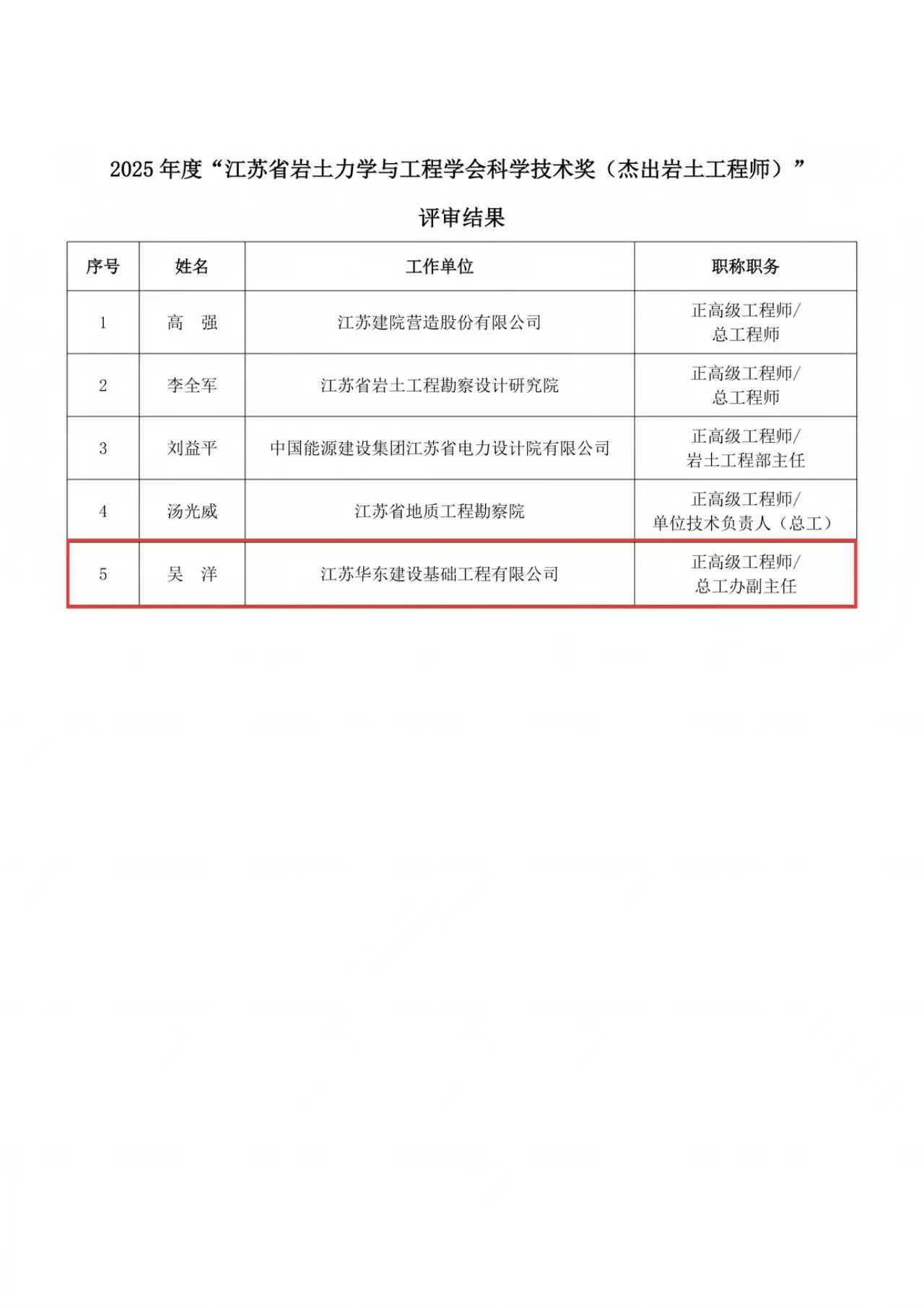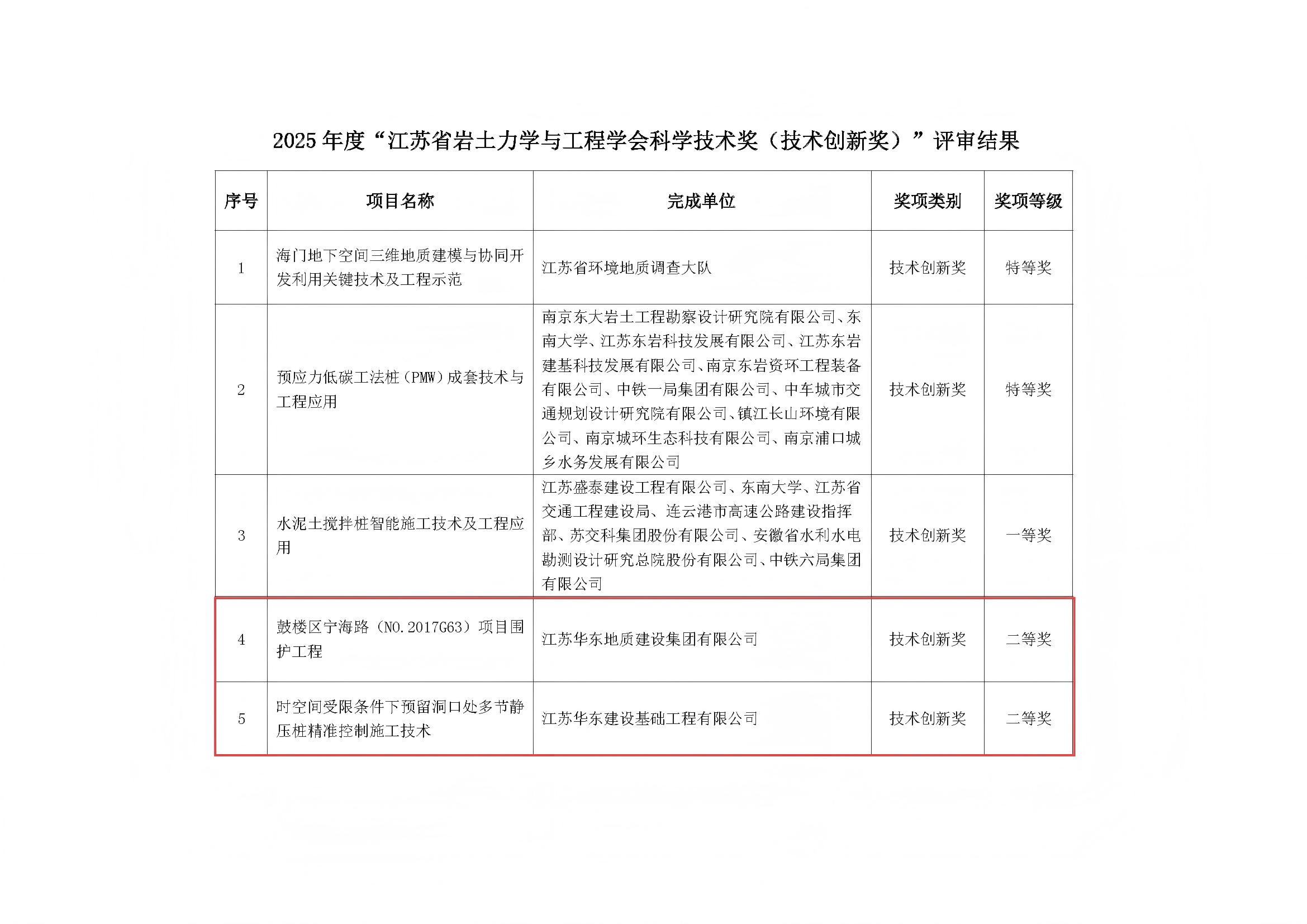 在江苏省地质局2024年度优秀成果评选中,华建公司申报的“时空间受限条件下预留洞口处多节静压桩精准控制施工技术”,荣获局2024年度优秀科技成果三等奖;“矽力微中国区总部项目桩基及基坑支护工程”,荣获局2024年度优秀项目成果三等奖。 江苏省岩土力学与工程学会科学技术奖